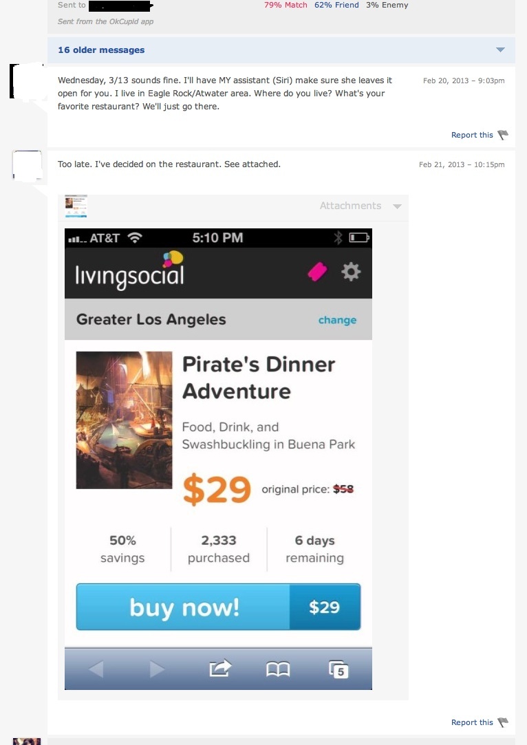 I for one think a Pirate’s dinner is kind of hilarious. The question remains though – is it okay to bust out a Groupon/LivingSocial deal on a date? What do you think?